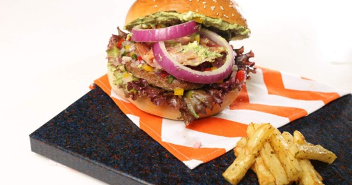 5. Para armar cada hamburguesa colocar en el pan una capa de guacamole, seguido de la lechuga y colocar la torta de carne, luego el pico de gallo, 2 tiras de tocino, las rodajas de tomate y la cebolla en aros y para finalizar otra capa de guacamole.