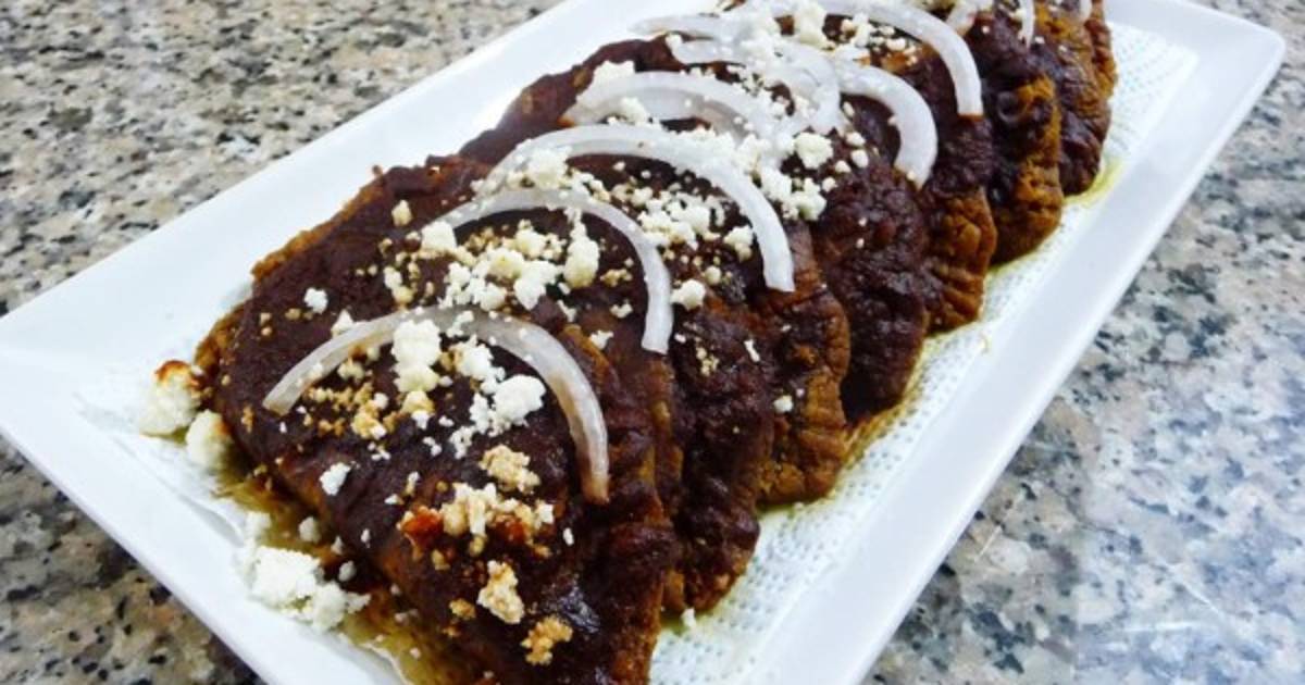 Sumergir las tortillas ya sofritas por el adobo para que tomen color y sabor. Una vez que estén rojas, comenzar a armar, rellenándolas perfectamente con la carne; cerrar dándoles la vuelta completa en el plato e ir montando de dos a tres enchiladas por plato.