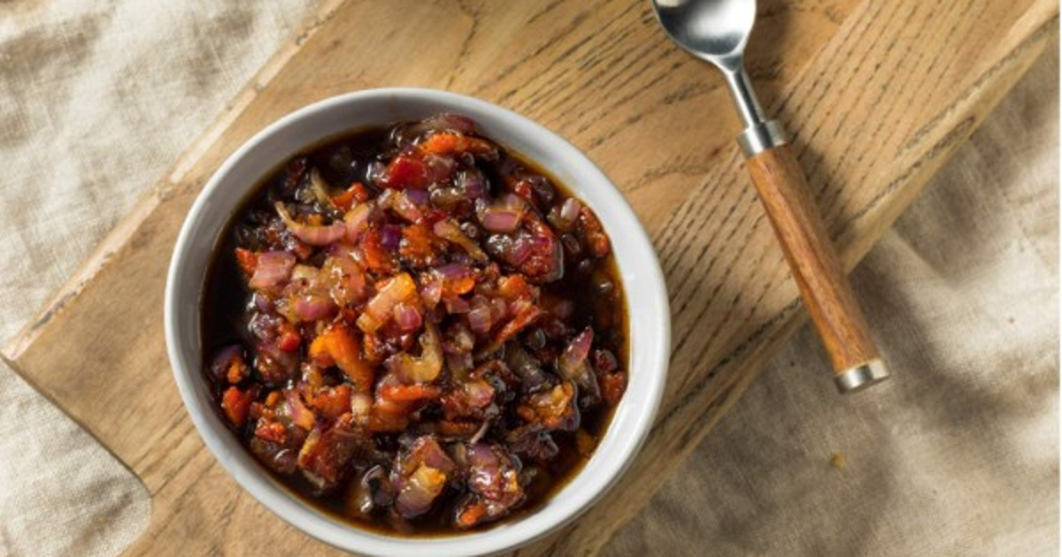 2. En una olla de fondo grueso previamente calentada a fuego medio, agregar el tocino y dejar que comience a dorarse y soltar su propia grasa hasta que se reduzca a la mitad.