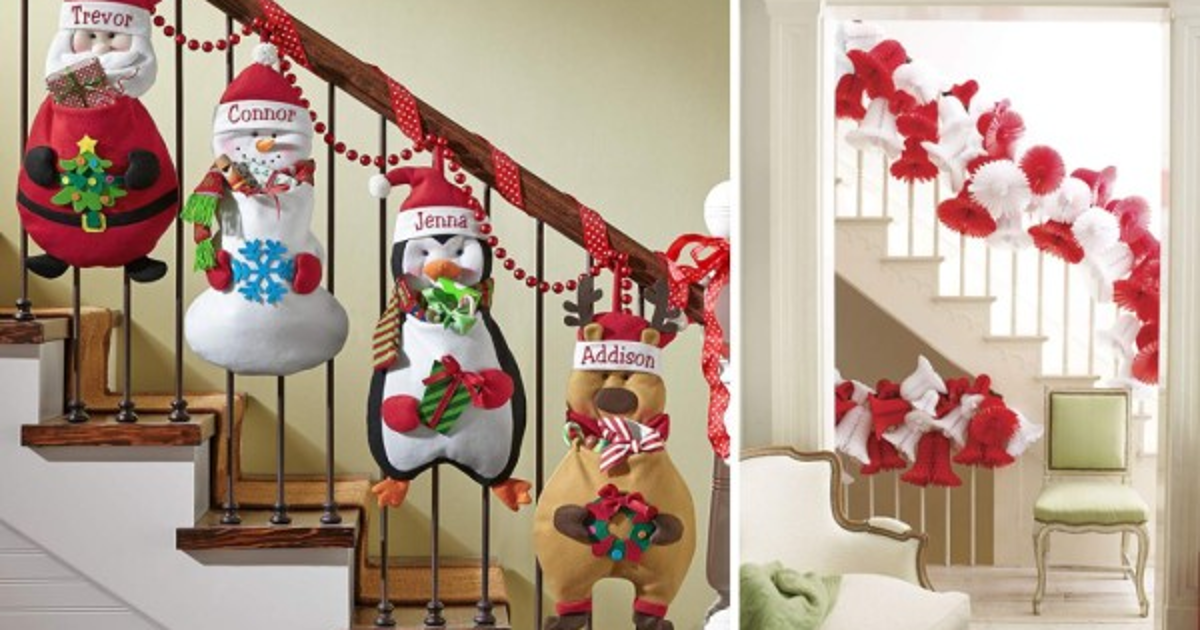 Las campanas de papel es otra original idea. Si utiliza los clásicos colores como el rojo, blanco y verde logrará ponerse a tono con la temporada. Las figuras colgantes de Santa Claus, Frosty, renos o pingüinos han evolucionado a maxi tamaños y espacios para depositar desde dulces hasta regalos. Todos ideales para decorar con cintas y cadenas las escaleras.
