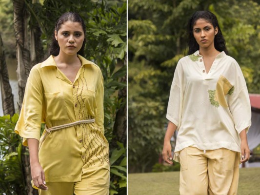 La colección incluye prendas para dama, destacando las blusas con bolsas grandes y pantalones.