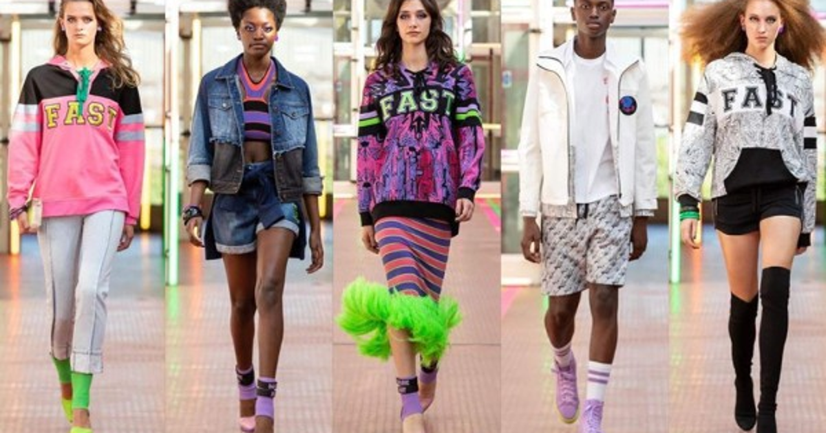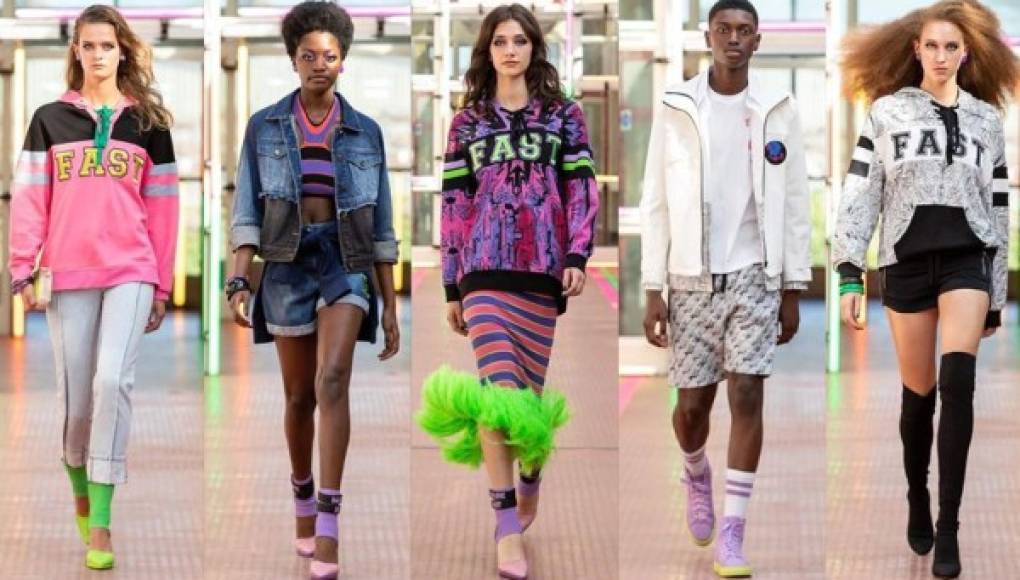 El rey del tricot Mark Fast optó por una colección más energética, en la que se atrevió a usar el verde y el rosa neón. Sobre una falda ajustada decorada con plumas, una sudadera con el logo 'FAST' da la pauta de su marcado estilo de streetwear.