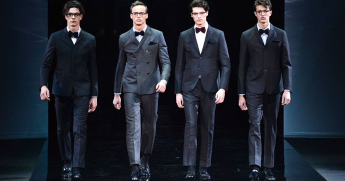 Giorgio Armani Las prendas que destacan de la colección son los trajes de tres piezas en tonos grises y corte slim, las camisas de color blanco sin corbata, los cárdigans en tonos apagados y las chaquetas con aires deportivos, que hicieron famoso a Armani. Además, el uso de abrigos largos y materiales como el terciopelo fueron una de las grandes sorpresas. Entre los accesorios, reinaron los zapatos de cuero en colores poco usuales como el azul, los bolsos estilo doctor en tamaño grande, los lentes de pasta en diferentes colores y los guantes de cuero.