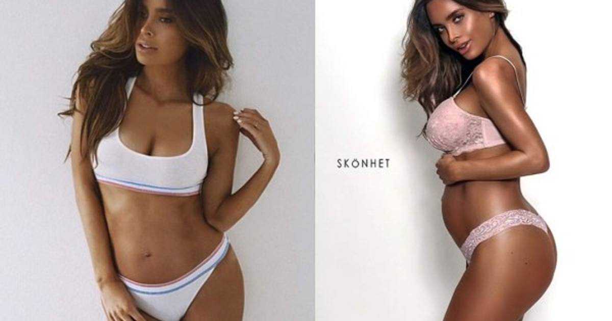 A ocho meses y medio de embarazo, la modelo Sarah Stage tiene un figura envidiable. La joven, de 31 años, causó revuelo en Instagram por documentar su proceso de gestación con fotos en las que aparece en lencería y trajes de baño, pero presumiendo su diminuta panza.