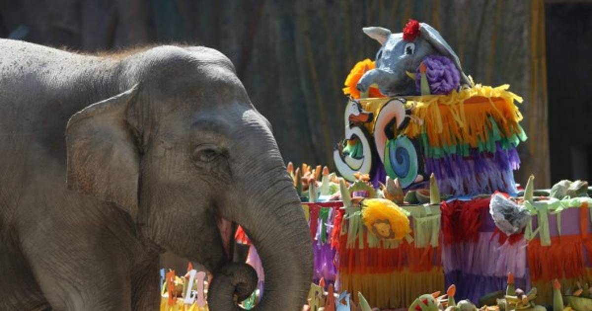 Con un pastel de cumpleaños hecho de sandía, papaya, melón, mazorcas, bananos y zanahoria, la elefanta ' Trompita', un icono de Guatemala, celebró esta semana sus 56 años muy emocionada.