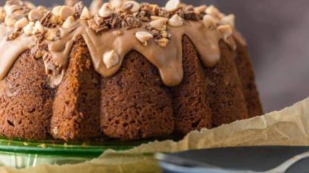 Esta receta se trata de un bundt cake de chocolate relleno con nada menos que cheesecake de mantequilla de maní o cacahuate, que es como lo conocen en otras partes.