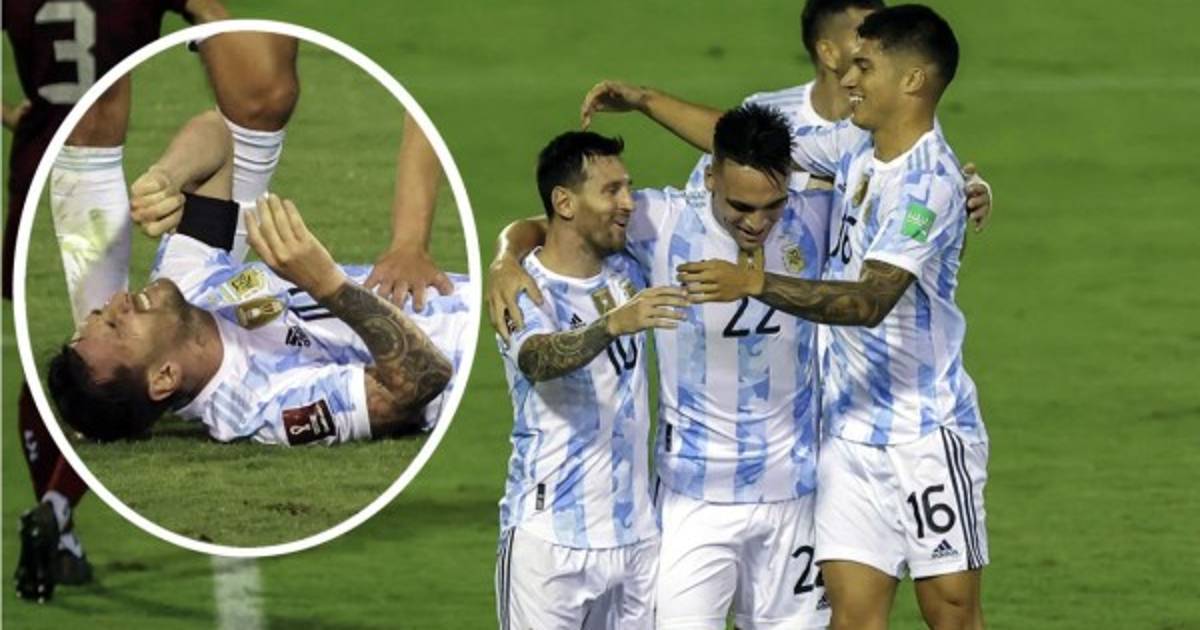 El dolor de Messi tras la dura falta que le hizo el venezolano Luis Adrián Martínez. Foto AFP