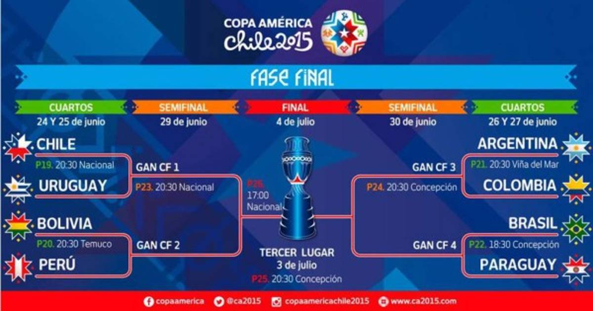 Los cuartos de final de la Copa América quedaron definidos este domingo con los emparejamientos Chile-Uruguay, Bolivia-Perú, Argentina-Colombia y Brasil-Paraguay.