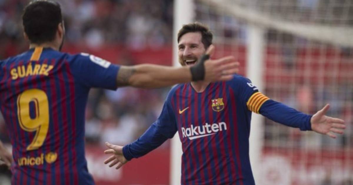 Con triplete de Lionel Messi y otro tanto de Luis Suárez, el club catalán remontó para vencer al cuadro sevillista y sigue firme en el liderato de la competición española.