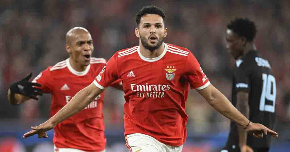 Rafa Silva (38), Gonçalo Ramos (45+2 y 57), Joao Mario (71, de penal) y el brasileño David Neres (77) anotaron los goles de las ‘Águilas’, mientras que el neerlandés Bjorn Meijer marcó el tanto del honor para el Brujas (87).