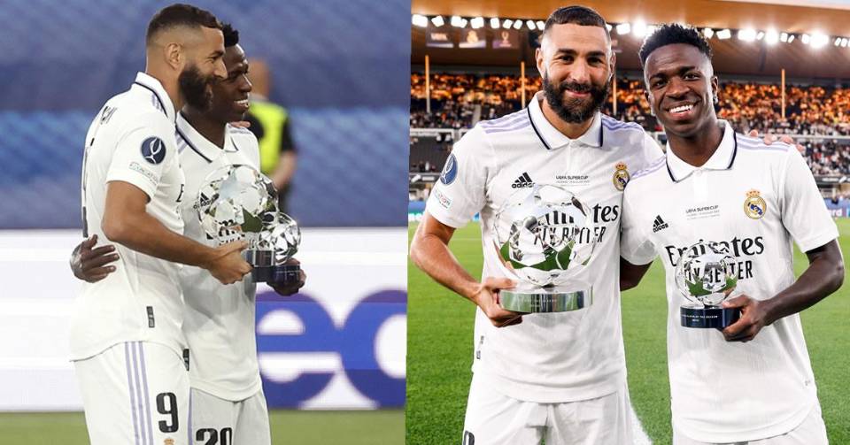La UEFA aprovechó los prolegómenos de la Supercopa de Europa que disputan en Helsinki (Finlandia) Real Madrid y Eintracht de Fráncfort para reconocer la extraordinaria temporada del francés Karim Benzema y del brasileño Vinicius Junior en la pasada edición de la Champions League, al entregarles el trofeo que les acredita como mejor futbolista y mejor jugador joven, respectivamente, de la pasada edición de la competición.