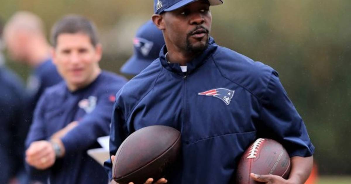 Brian Flores recibe indicaciones de Bill Belichick, entrenador y jefe de los Patriots.