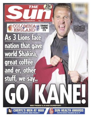 'Go Kane!', tituló el tabloide en portada, con una foto del delantero estrella inglés Harry Kane.