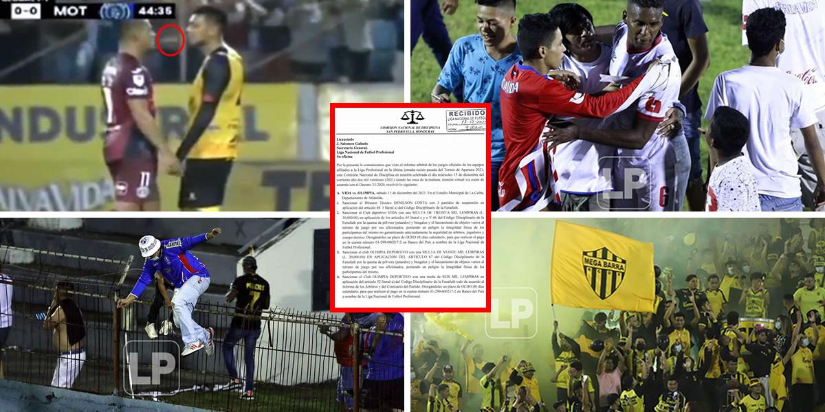 El ente disciplinario multó al Real España y al Vida con 30 mil lempiras a cada equipo debido a que sus aficionados quemaron pólvora y lanzaron objetos a la cancha, poniendo en peligro la integridad física de los futbolistas, cuerpo técnico y árbitros.