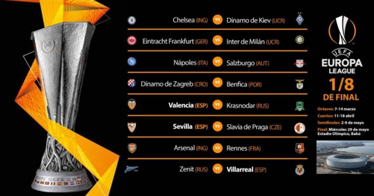El doble duelo hispano ruso que Valencia y Villarreal afrontarán ante Krasnodar y Zenit, junto al cruce Sevilla-Slavia de Praga serán parte de los octavos de final de la UEFA Europa League, en la que el Chelsea se jugará su futuro ante el Dinamo de Kiev y el Arsenal ante el Rennes, verdugo del Betis.