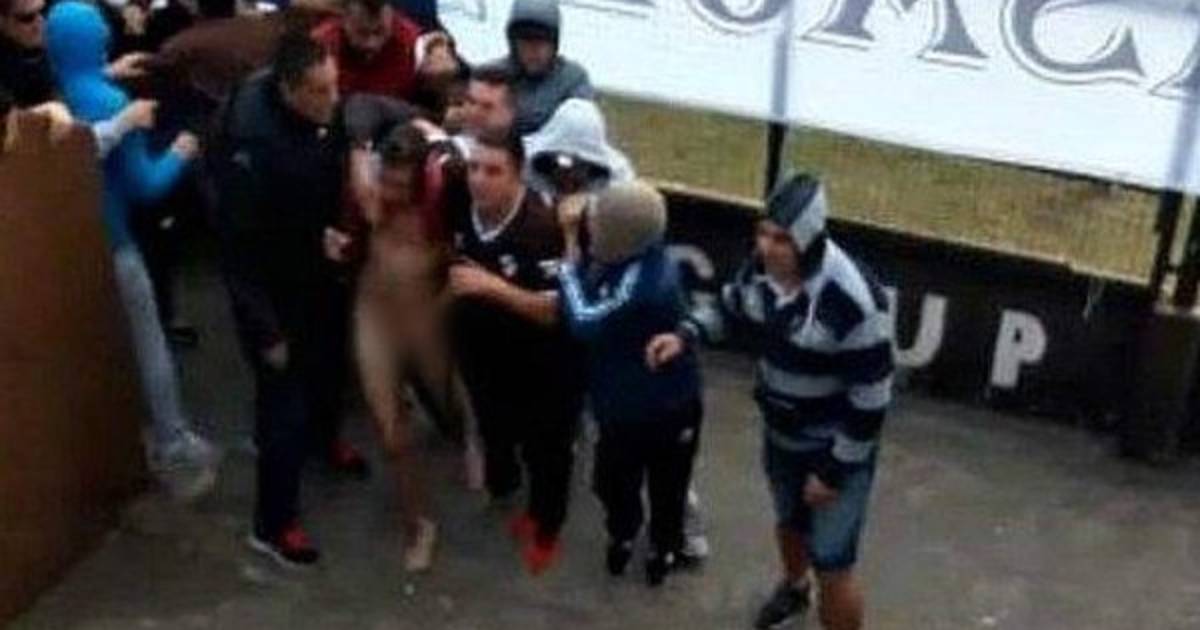 Los videos divulgados por la prensa local mostraron a una turba de unos 30 hinchas de Platense que rodearon al joven, luego lo golpearon y le quitaron todas sus ropas para sacarlo desnudo y a empujones del estadio.