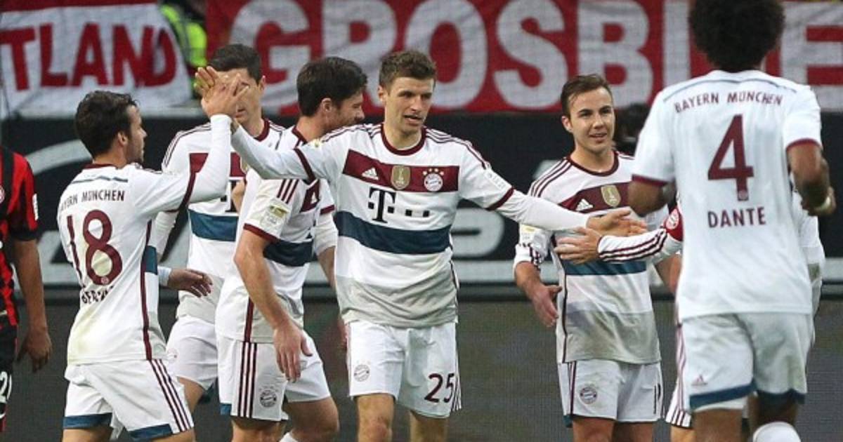 El Bayern Múnich goleó a domicilio al Eintracht Fráncfort (0-4) con tres goles de Thomas Müller y uno del suizo Xerdhan Shaqiri con lo que consolida del liderato de la Bundesliga, a falta de que dos de sus perseguidores, el Wolfsburgo y el Borussia Mönchengladbach, jueguen este domingo sus partidos.