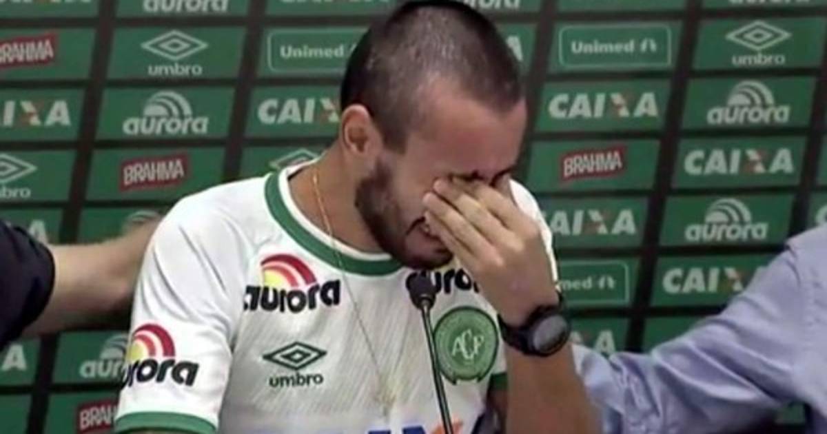 El lateral izquierdo del club brasileño Chapecoense, Alan Ruschel, no pudo contener las lágrimas en una rueda de prensa en el estadio Arena Condá tras la tragedia ocurrida en La Unión, Antioquia, donde murieron sus compañeros de equipo.
