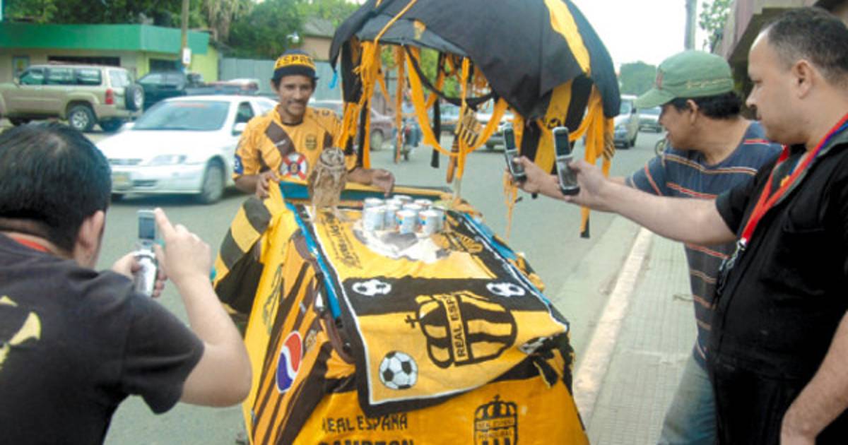 Más identificado con su amado Real España no puede andar: camiseta del equipo, el gorro con los colores amarillo y negro, una bandera que le cubre su carreta de trabajo con los mismos matices, y por sobre todo, un personaje que poco a poco se va ganando la simpatía de su clientela.