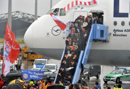 Bastian Schweinsteiger y el DT Jupp Heynckes bajaron del avión uno a cada lado de la copa. Philipp Lahm y Thomas Müller también estuvieron cerca del trofeo. Robben la llevó hasta el interior del aeropuerto. “Es pesada, no se puede tener todo el día”, soltó el capitán entre risas.