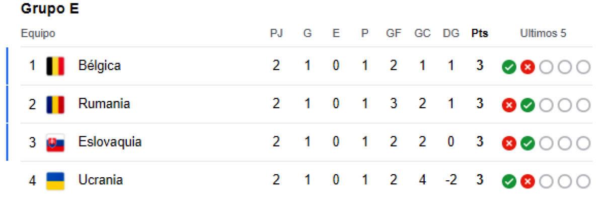 La victoria de Bélgica sobre Rumania y el triunfo, con remontada incluida, de Ucrania ante Eslovaquia comprime el grupo con cuatro selecciones empatadas a tres puntos. Esto supone que todo esté en juego en la última jornada con los siguientes enfrentamientos: Ucrania-Bélgica y Eslovaquia-Rumanía.