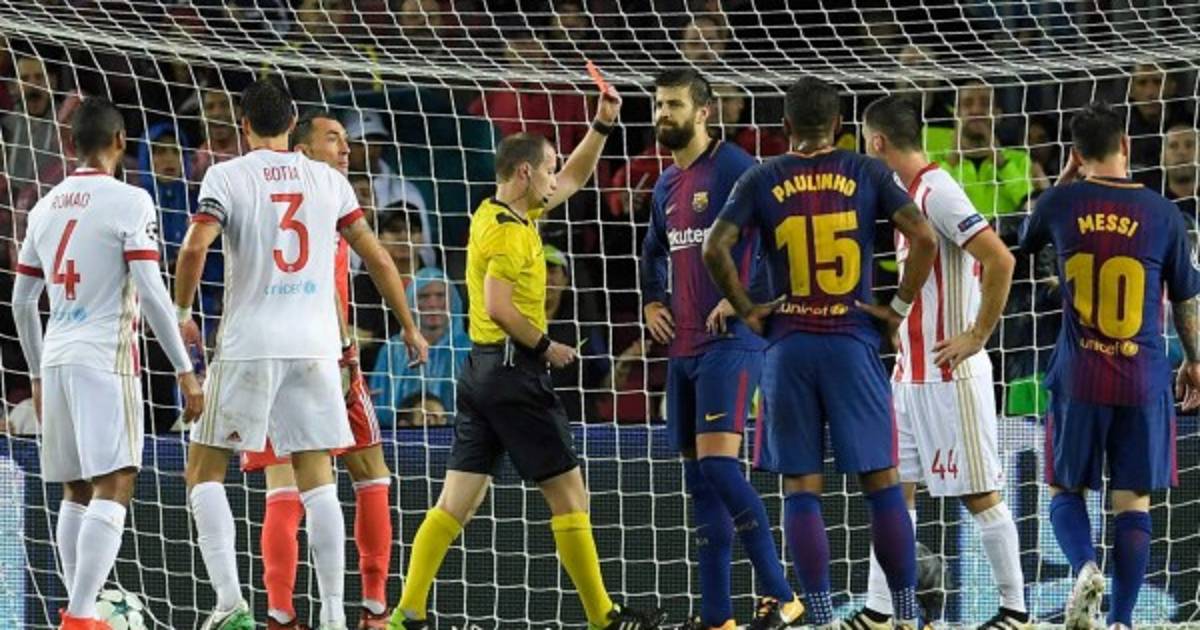 El defensor Gerard Piqué se fue expulsado de forma increíble en el duelo entre FC Barcelona y Olympiakos por la tercera jornada de la fase de grupos de la Uefa Champions League.