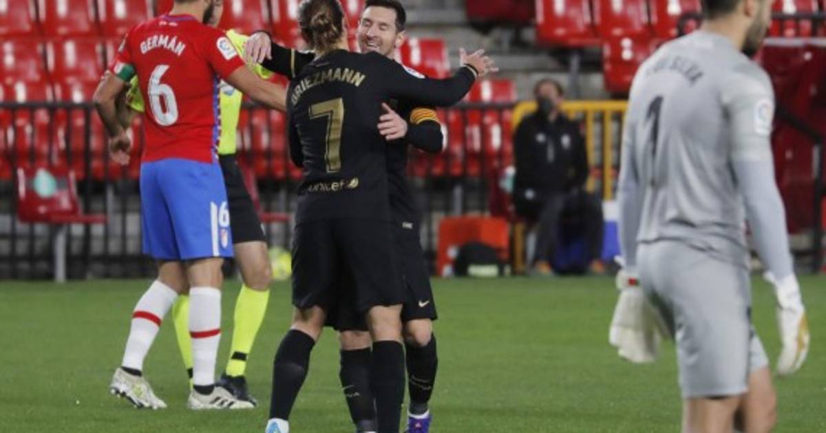 0 - Granada: Rui Silva; Foulquier, Duarte, Germán, Carlos Neva (Vallejo, m,46); Yan Eteki, Montoro (Luis Milla, m.46), Yangel Herrera (Alberto Soro, m.67); Antonio Puertas, Machís (Kenedy, m.64) y Soldado (Luis Suárez, m.46).4 - Barcelona: Ter Stegen; Dest (Junior, m.81), Umtiti, Mingueza, Jordi Alba; De Jong (Pjanic, m.65), Sergio Busquet, Pedri (Trincao, m.73); Dembele (Riqui Puig, m.73), Messi (Braithwaite, m.65) y Griezmann.