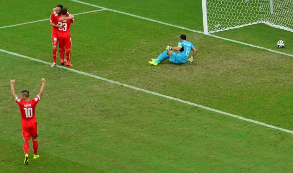 Josip Drmic apareció destapado por izquierda, se quitó fácilmente a 'Muma' Bernárdez y habilitó a Xherdan Shagiri quien empalmó la pelota de zurda y con un toque bajo superó a Noel Valladares. Era el 3-0, minuto 71. Ya era humillación.