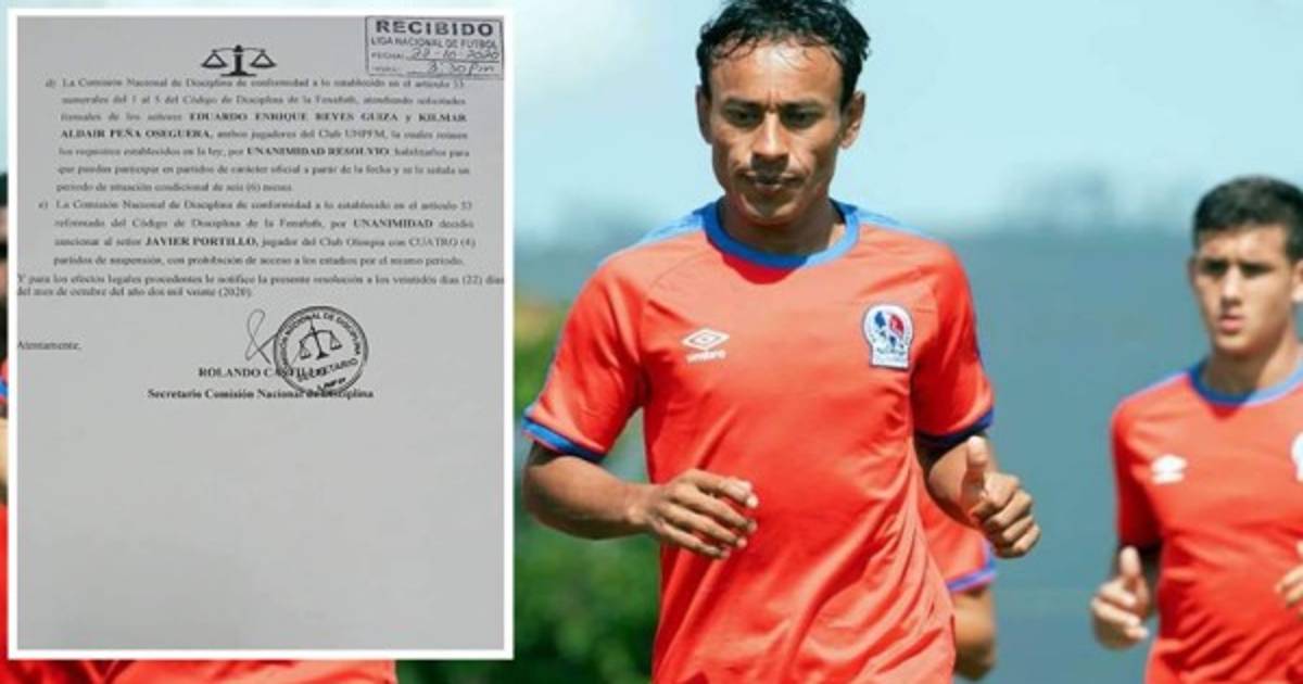 'La Comisión Nacional de Disciplina de conformidad a lo establecido en el artículo 53 reformado del Código de Disciplina de la Fenafuth, por unanimidad, decidió sancionar al señor Javier Portillo, jugador del Club Olimpia con cuatro partidos de suspensión, con prohibición de acceso a los estadios por el mismo período', dice el comunicado.