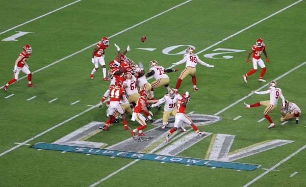 En el primer cuarto el pateador Robbie Gould logró gol de campo de 38 yardas y le dio la ventaja al equipo de San Francisco con marcador de 0-3, pero Mahomes empezó a utilizar sus piernas antes de concluir el primer cuarto, cuando corrió una yarda y llegó hasta la zona de las diagonales para conseguir marcador de 7-3.