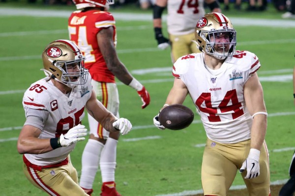 Casi al concluir el segundo cuarto, el mariscal de campo Jimmy Garoppolo, de los 49ers, campeones de la Conferencia Nacional (NFC), que disputaban su séptimo Super Bowl en la historia del equipo, encontró a su receptor Kyle Juszczyk con envío de 15 yardas bueno para anotación, y el equipo de San Francisco logró el empate a 10.
