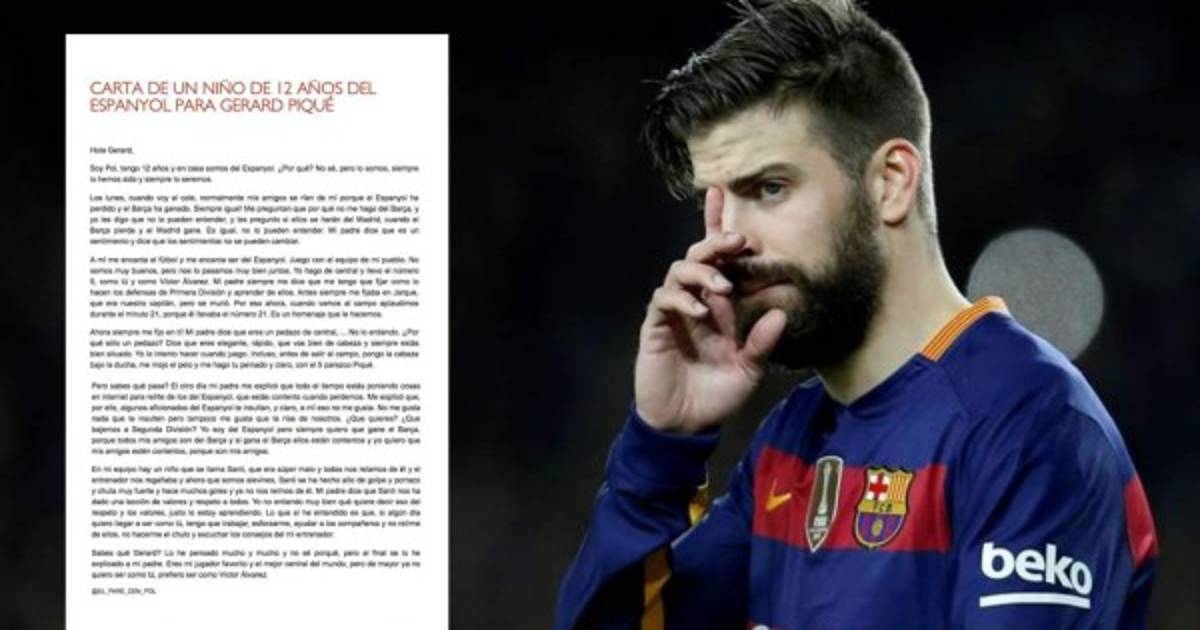 La carta de Pol, un joven aficionado del Espanyol de 12 años, al defensa del FC Barcelona, Gerard Piqué y compartida por su padre a través del blog 'El Pare d'en Pol' se está haciendo viral en las últimas horas.