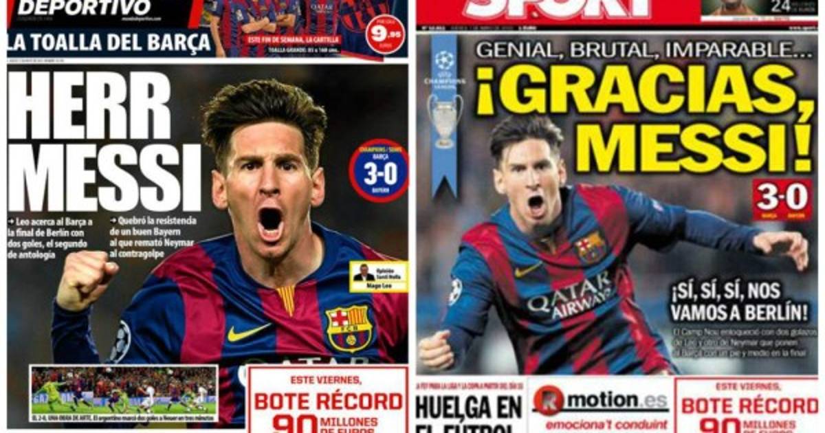 El Mundo Deportivo de Barcelona resalta en su portada y sobre una foto de Messi celebrando uno de los goles el titular 'Herr Messi', en el que recalca que 'Leo acerca al Barça a la final de Berlín con dos goles, el segundo de antología' y también que 'Quebró la resistencia de un buen Bayern al que remató Neymar al contragolpe'.