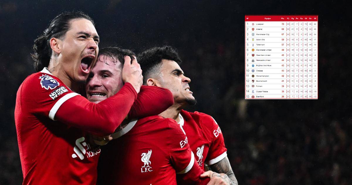 En la tabla, la formación de Jürgen Klopp recupera los mandos, ahora con 70 puntos, dos más que el Arsenal (2º, 68) y tres más que el Manchester City (3º, 67), vigente triple campeón.