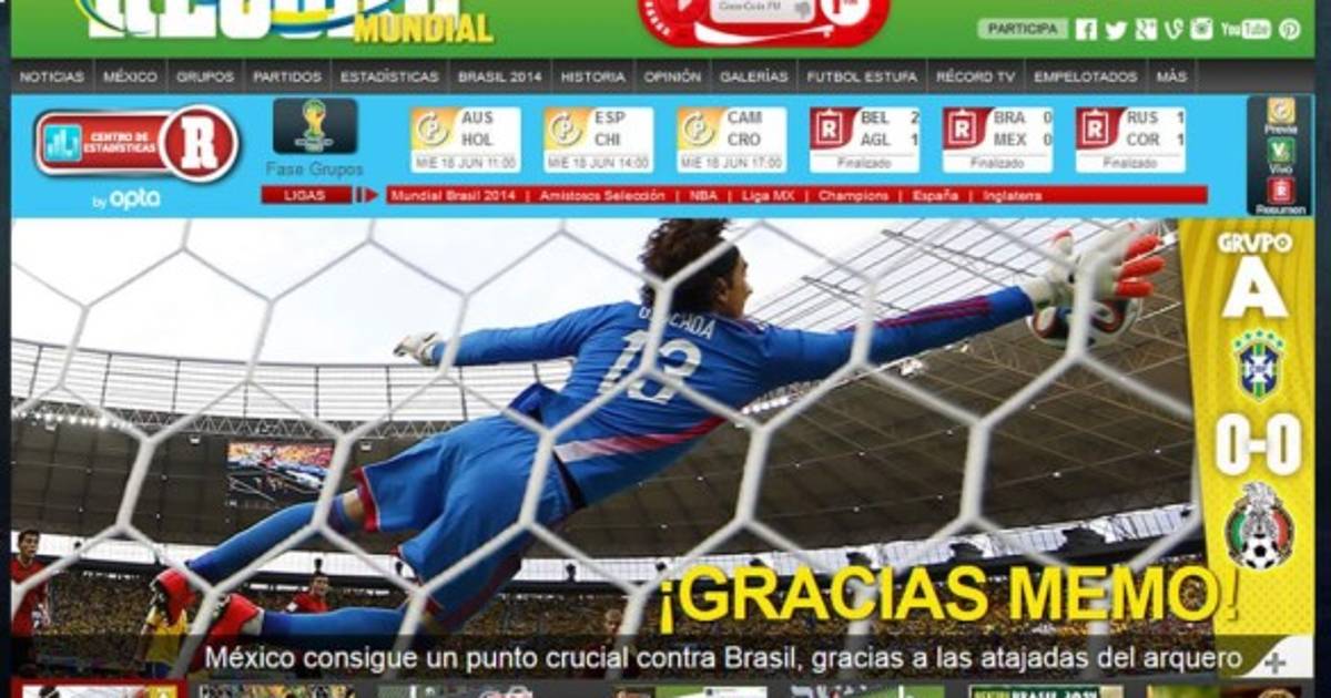 Récord: 'Gracias Memo, el héroe nacional'. 'México y Ochoa empatan con Brasil'. 'El portero acabó de tajo con las dudas sobre su titularidad y sacó cada disparo que llegó a su portería. México jugó de tú a tú con Brasil y logró un 0-0 que supo a gloria y demostró que se puede competir'.