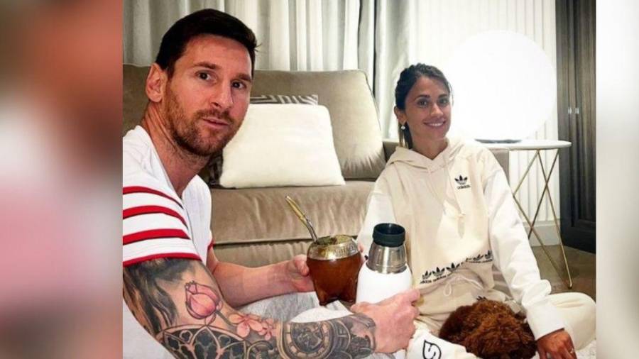 En la foto se le ve sonriente en su sofá y tomando mate, junto a su esposa Antonella Roccuzzo y su caniche Toby.
