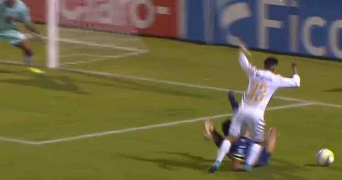 Se jugaban los 92 minutos, cuando Michaell Chirinos recibió un pase del “Patón” Mejía, luego ingresó al área y el zaguero Denil Maldonado se lanzó por lo que el extremo albo inmediatamente se dejó caer.
