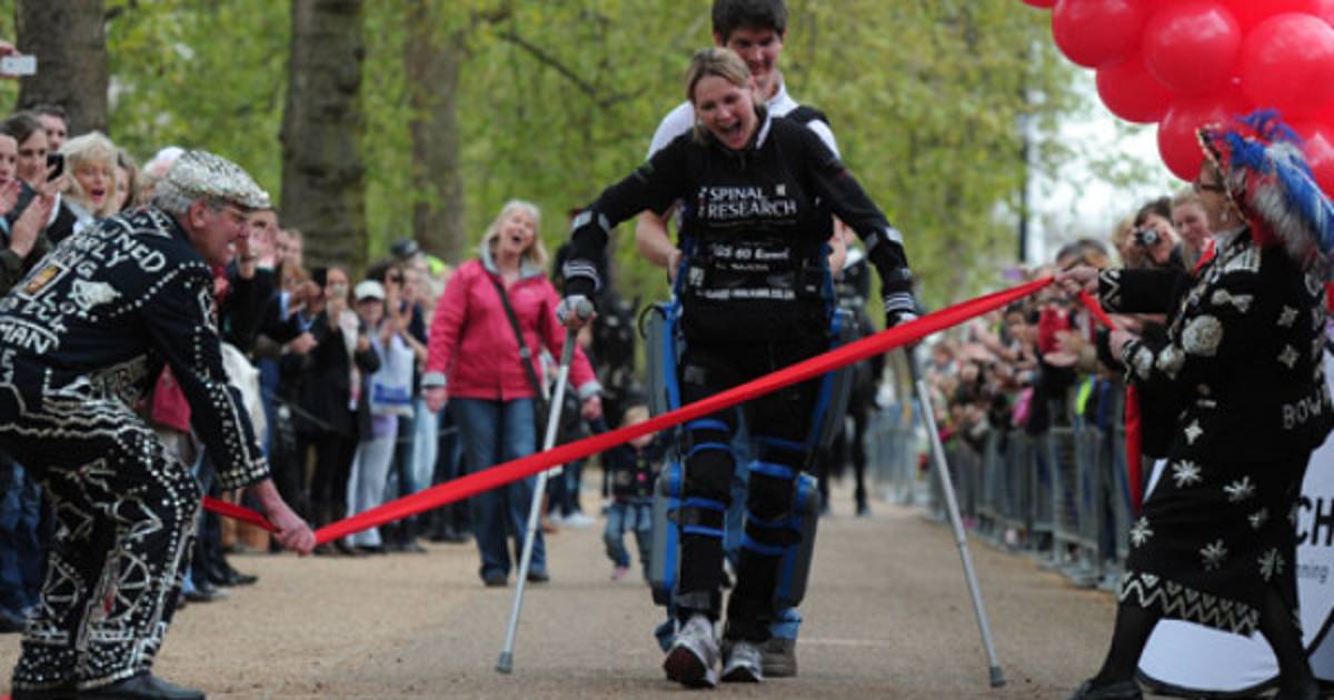 La equipación que llevaba, que cuesta 43.000 libras (70.000 dólares, 53.000 euros), permite a gente con parálisis en las extremidades inferiores ponerse de pie, andar y subir escaleras a través de sensores y de un sistema informático incorporado.