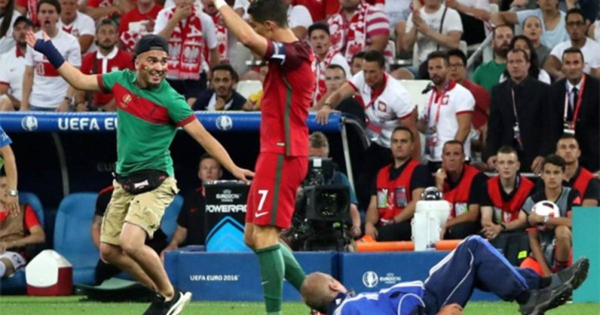 Un aficionado saltó al terreno de juego e intentó abrazar a Cristiano Ronaldo, en el minuto 110 del partido de la Eurocopa que disputan Polonia y Portugal, en el estadio Velodrome de Marsella.