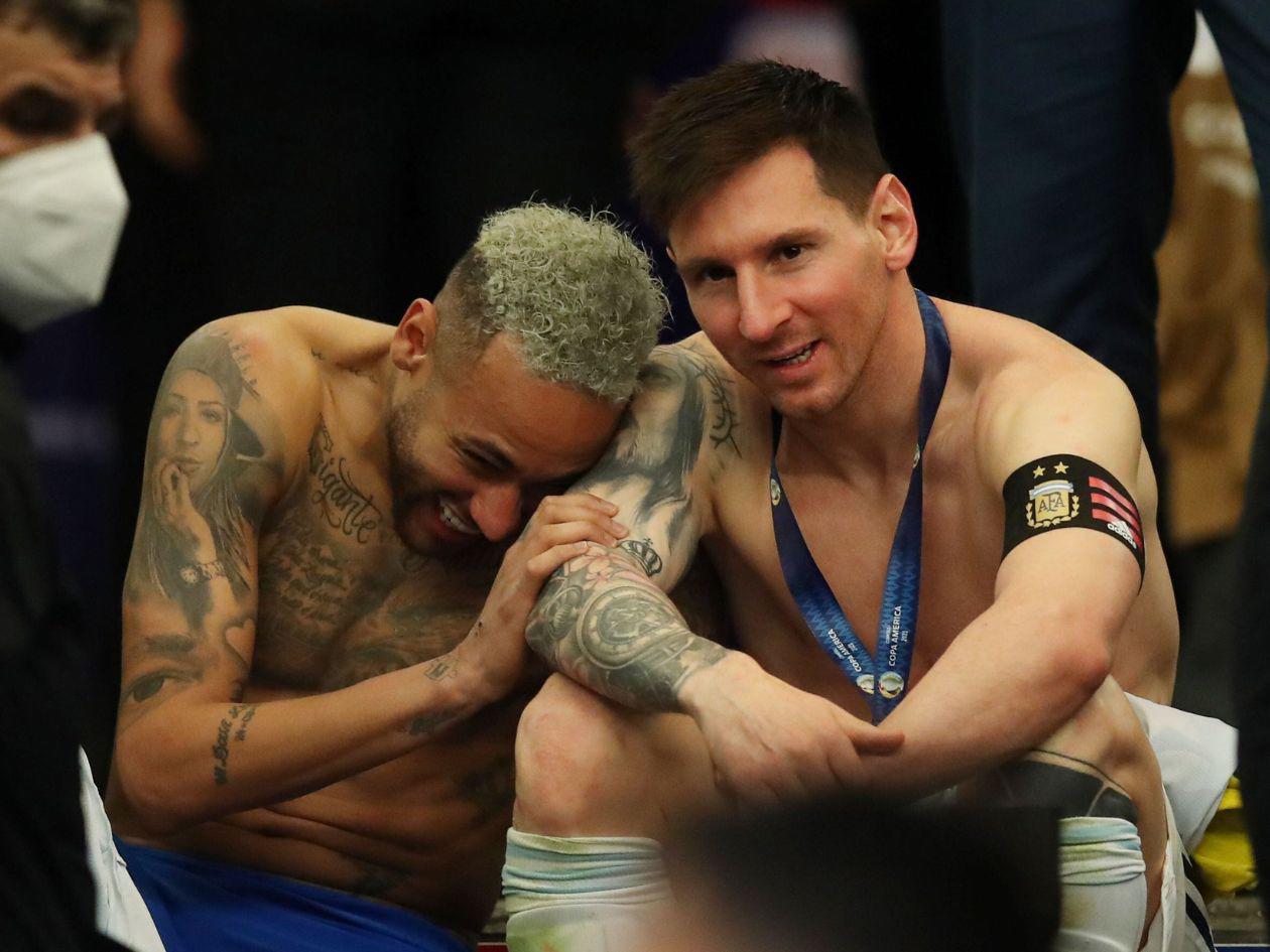 Neymar envió las camisetas del Santos, exhibidas por el capitán de la selección argentina y sus hijos Thiago y Mateo, y que contienen una dedicatoria del brasileño a su amigo y antiguo compañero en el FC Barcelona y el París Saint-Germain (PSG).
