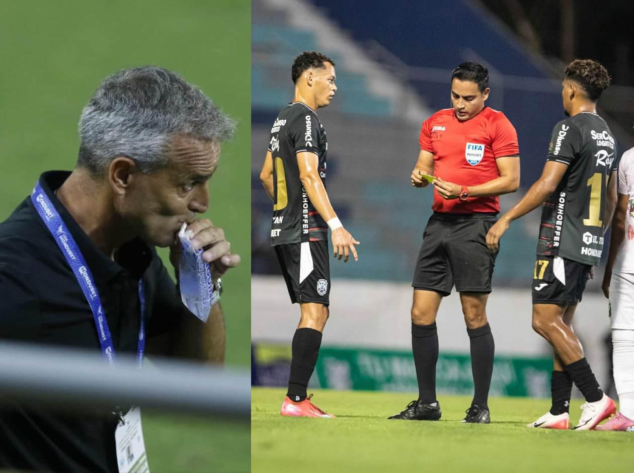 Yo le decía al árbitro que a nosotros cuando estudiamos en las escuelas de técnicos de Argentina nos enseñan el reglamento, por que si no no podemos trabajar de esto. Entonces, nosotros sabemos que cuando hay una falta desde atrás sin posibilidad de disputar la pelota, porque la pelota está por delante y el jugador lo barre de atrás es amarilla, porque no hay intención de quitarle la pelota. Le dije, después la vamos a ver por televisión, seguramente la veremos por televisión. Ya me vi la de Real España, la de Motagua que no me dejaron hacer el cambio. El otro día la de Olimpia cuando mete la mano Marco Montiel ni la dieron por televisión.