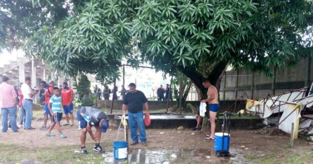 Luego del encuentro, los jugadores todos enlodados tuvieron que conseguir un par de baldes, llenarlos de ague una llave que está al lado del recinto deportivo.