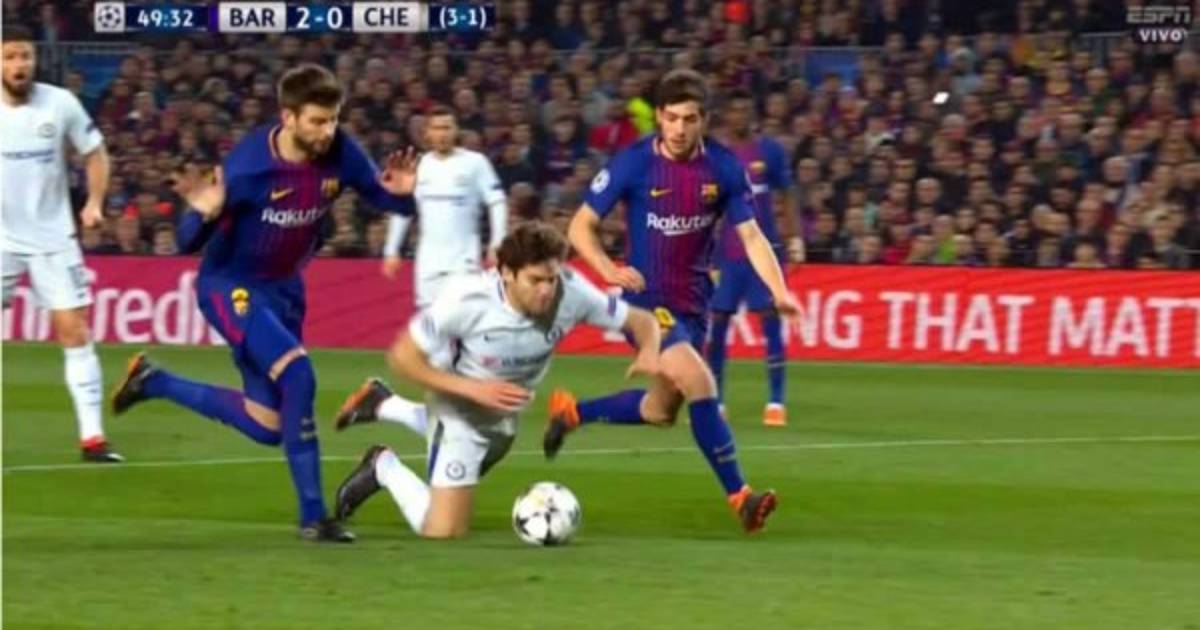La controversial jugada fue en el minuto 49. Marcos Alonso recibió el balón en el área y cuando iba a disparar cayó al césped ante la marca de Gerard Piqué.