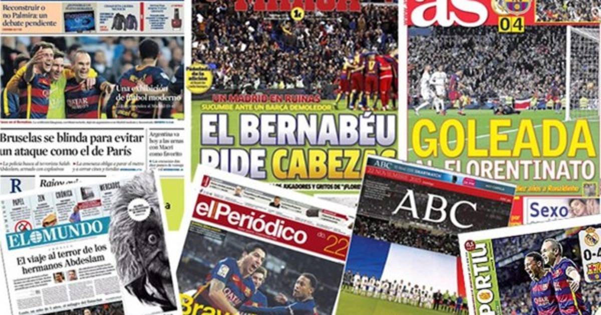 El 0-4 que el Barcelona le endosó al Real Madrid en el estadio Santiago Bernabéu en el Clásico del fútbol español, ha tenido un juicio unánime por parte de la prensa deportiva española, en donde los azulgranas fueron muy superiores.