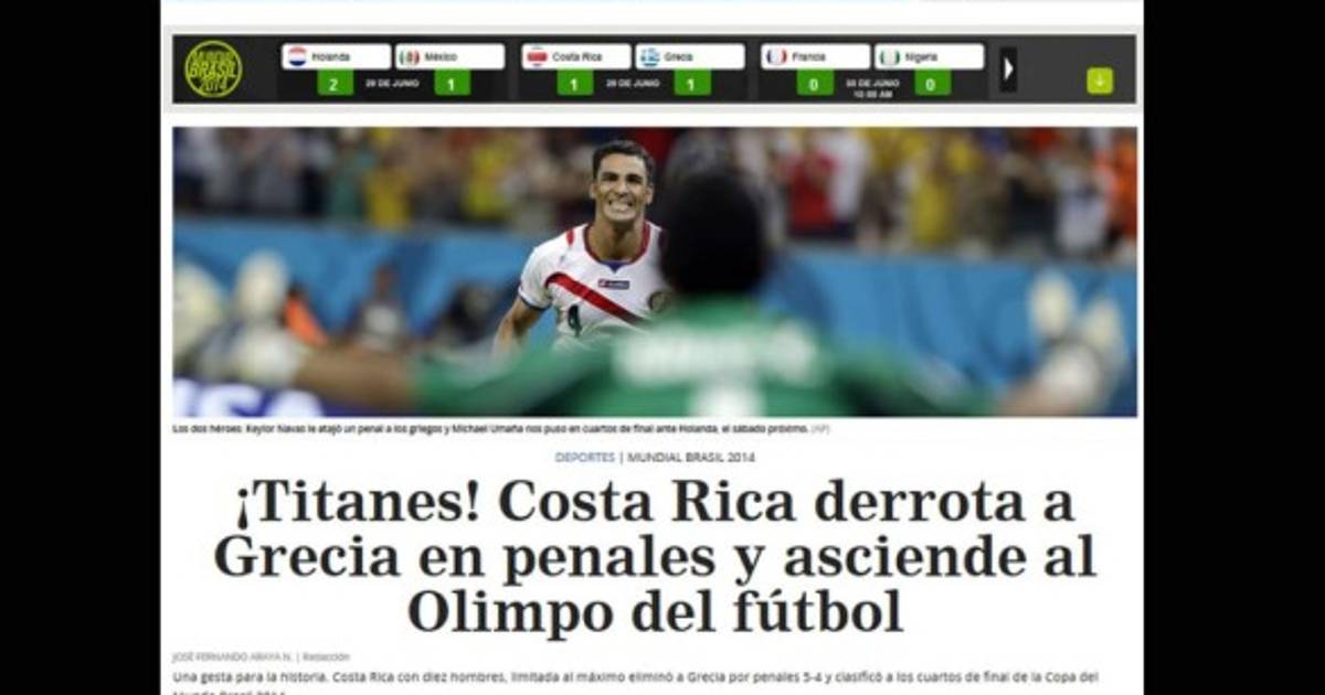 'Una gesta para la historia. Costa Rica con diez hombres, limitada al máximo eliminó a Grecia por penales 5-4 y clasificó a los cuartos de final de la Copa del Mundo Brasil 2014'.