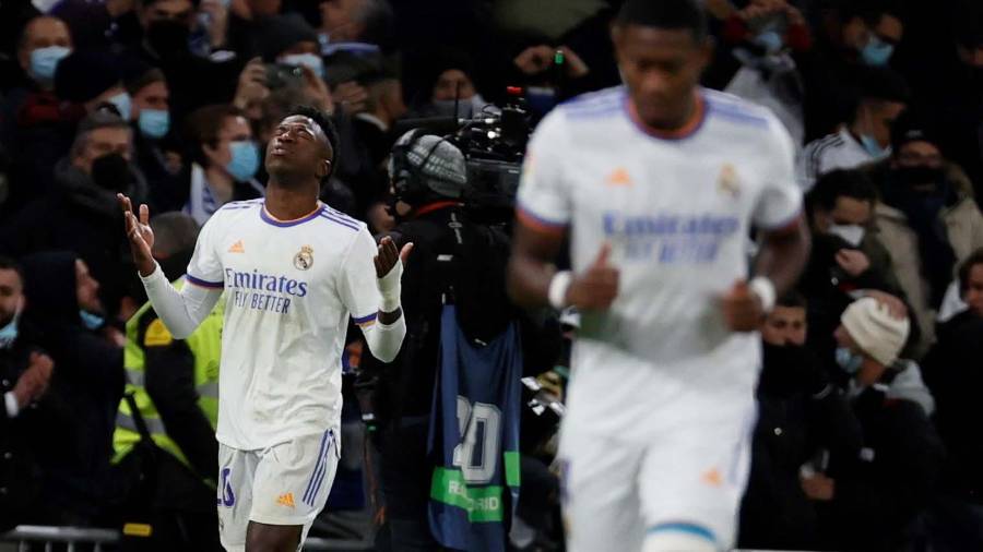 Inmediatamente Vinicius fue felicitado por sus compañeros del Real Madrid y todo el Santiago Bernabéu se puso de pie para aplaudirle al crack brasileño.