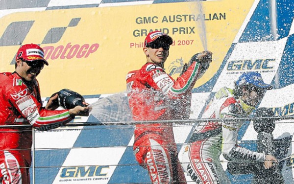 Casey Stoner (Ducati) dominó ayer de principio a fin el Gran Premio de Australia de MotoGP, estrenando su corona mundial con una victoria ante su público, mientras el español Jorge Lorenzo (Aprilia) ganó en 250cc y está muy cerca de revalidar su título.