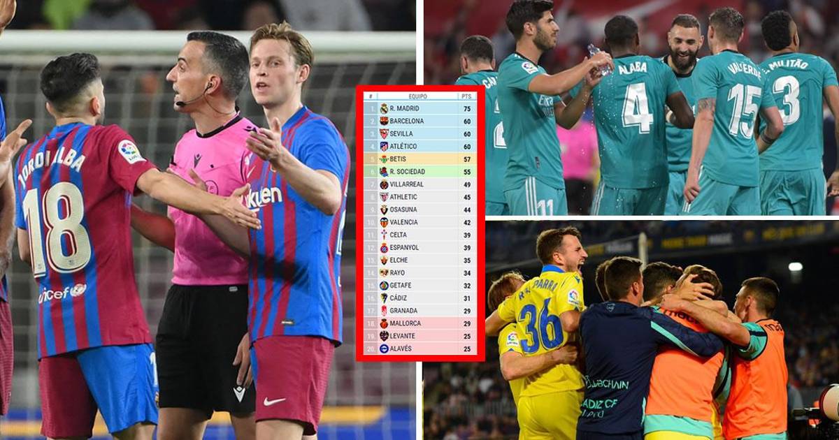 A falta de seis jornadas para el final de temporada de la Liga Española, el Real Madrid le saca 15 puntos de ventaja al Barcelona tras el duro tropiezo del equipo de Xavi Hernández (0-1) contra el Cádiz en el Camp Nou.