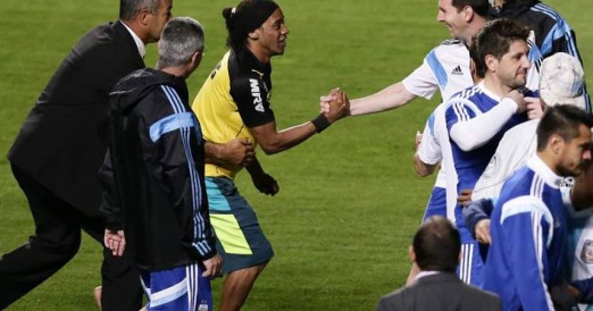 El jugador de Argentina Lionel Messi saludó a un hincha parecido a Ronaldinho que ingresó al campo durante un entrenamiento en el estadio Arena Independencia en Belo Horizonte, Brasil.