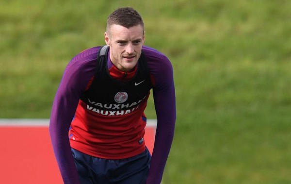 El delantero inglés Jamie Vardy participa en una sesión de entrenamiento en el St George's Park en Burton. AFP